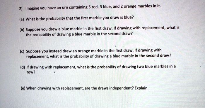 Imagine you have an urn containing 5 red, 3 blue, and orange marbles in it: (a) What Is the probability that the first marble you draw is blue? (b) Suppose you drew blue marble in the first draw: If drawing with replacement, what is the probability of drawing blue marble in the second draw? (c) Suppose vou instead drew an orange marble in the first draw: If drawing with replacement; what is the probability of drawing blue marble in the second draw? (d) If drawing with replacement; what is the probability of drawing two blue marbles in a row? (e) When drawing with replacement, are the draws independent? Explain;